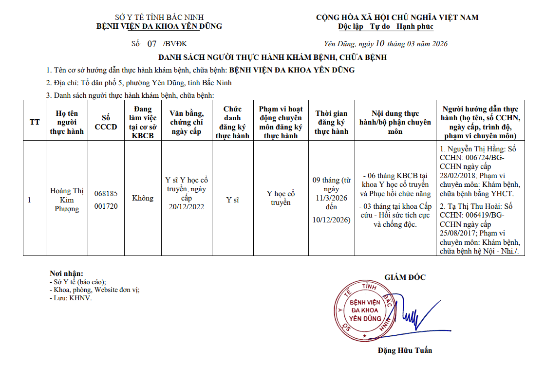 1. Tên cơ sở hướng dẫn thực hành khám bệnh, chữa bệnh: BỆNH VIỆN ĐA KHOA YÊN DŨNG
