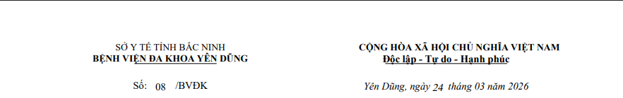 1. Tên cơ sở hướng dẫn thực hành khám bệnh, chữa bệnh: BỆNH VIỆN ĐA KHOA YÊN DŨNG