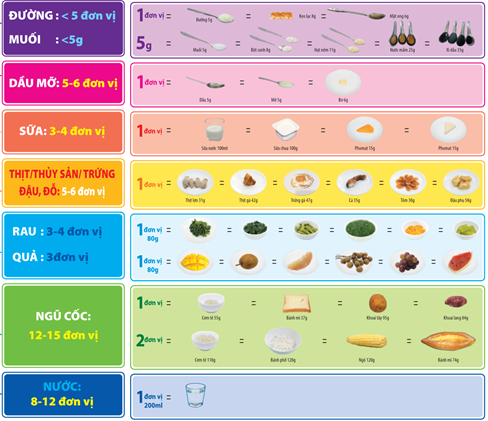 Để cho việc ước lượng số lượng mỗi thực phẩm cần ăn và áp dụng lựa chọn đa dạng thực phẩm được dễ dàng, số lượng thực phẩm được trình bày dưới dạng các đơn vị ăn đối với mỗi thực phẩm và có